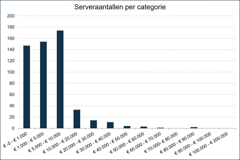 Met behulp van het eV-ict datamodel kunt u ook het aantal servers per categorie inzien én de totale serverkosten per categorie. In deze voorbeeldanalyses blijkt dat er in organisatie X een groot aantal kleine servers aanwezig is. Dit kan aanleiding zijn voor nader onderzoek om te kijken of hier consideratie kan plaatsvinden.